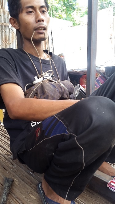 Maka melepas lengan itu artinya ia memang harus sudah benar-benar “finish” bekerja. Jika harus dipakai lagi, seperti halnya computer harus restart ulang dari awal. Bli Tawan menyebutkan bahwa lengan robot ini sebenarnya hanya bersifat membantu saja. “Saya enggak mau terkenal, saya hanya mau bekerja”, kata Bli Tawan kepada kami. “Kalau saya tidak nekat buat lengan buatan itu, gigi dan kaki saya nanti harus ikut bekerja. Kepala harus digerakkan ke kiri kanan (digelengkan) agar tangan kiri saya mengikuti gerakan yang saya inginkan. Susah saya jadinya,”, bli Tawan menjelaskan sambil memasang sebuah sarung tangan yang diikatkan dengan tali kompor dan diikatkan ke tangan serta digigit untuk menggerakkan tangannya. Agak ribet dan membuat saya menjadi iba melihatnya.